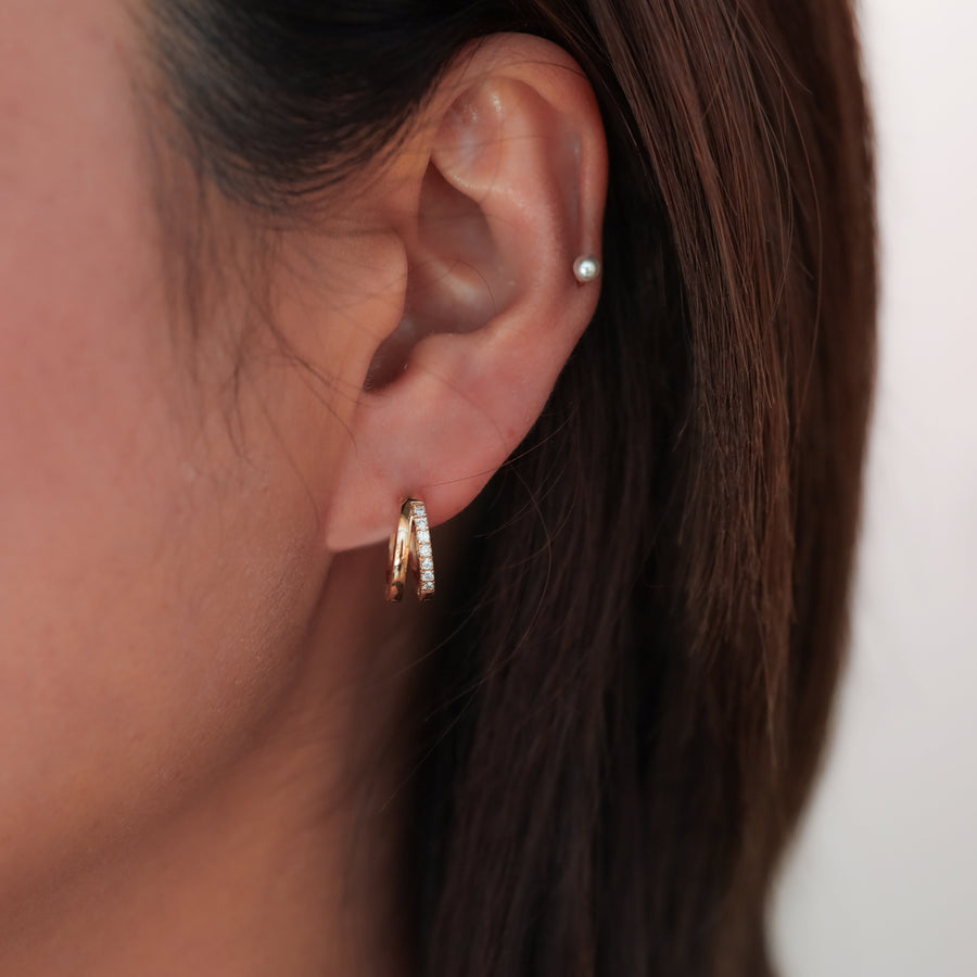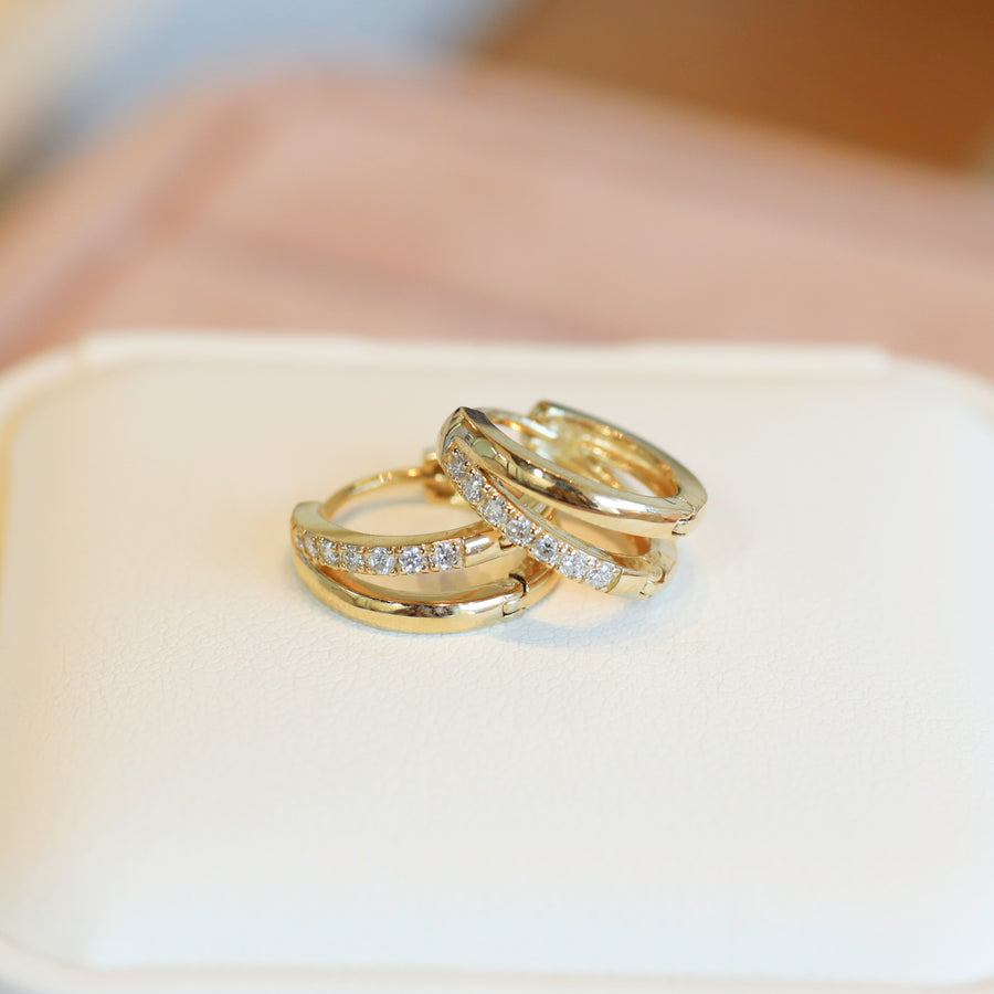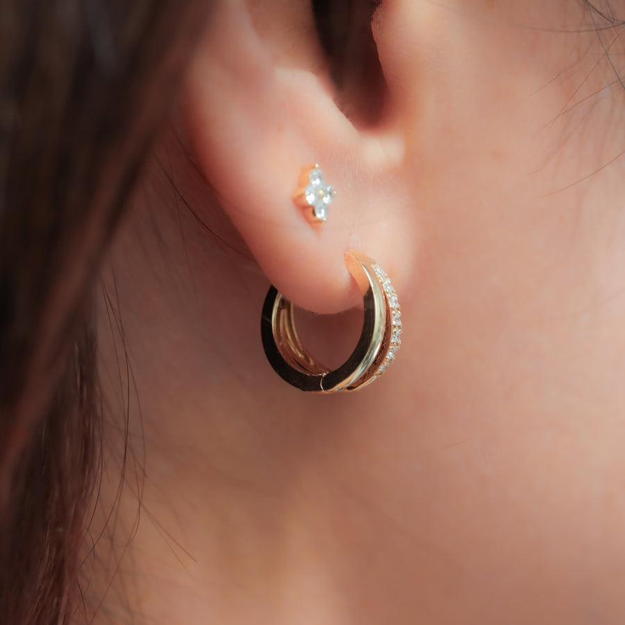 Double Arc with Lab Diamonds Accent Huggie Earrings – 14K Solid Gold Dual Hoop