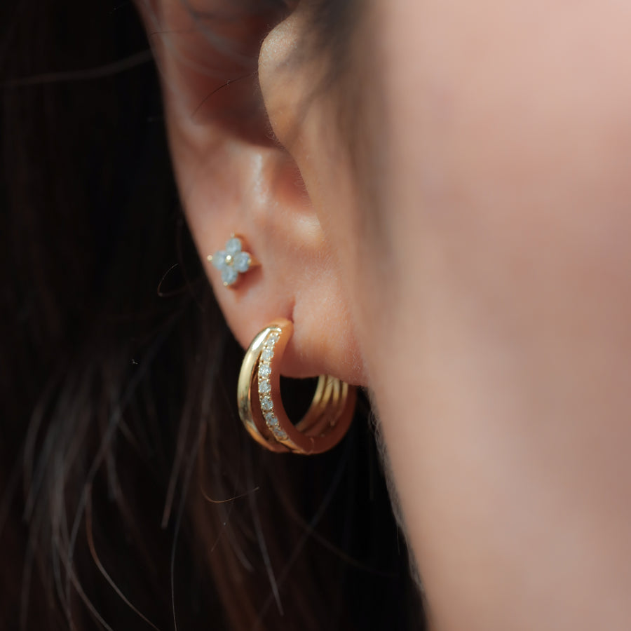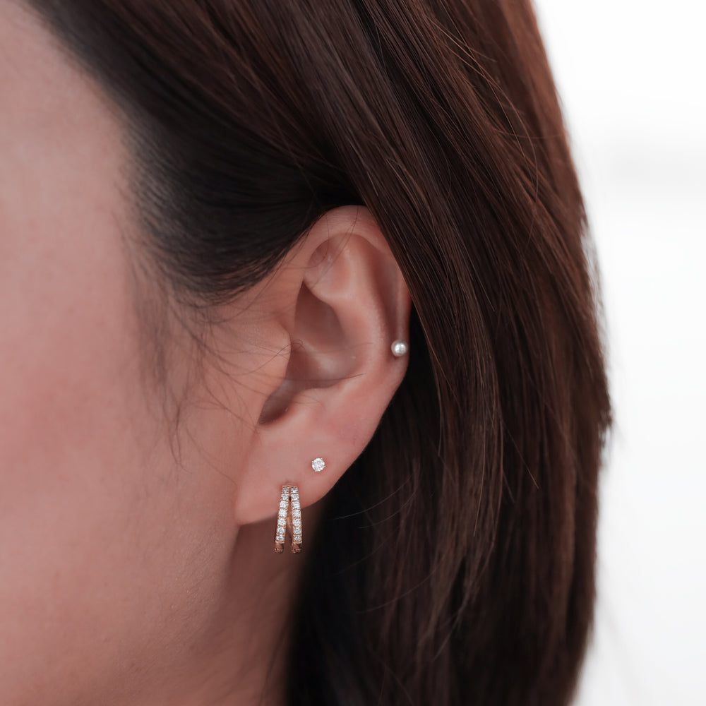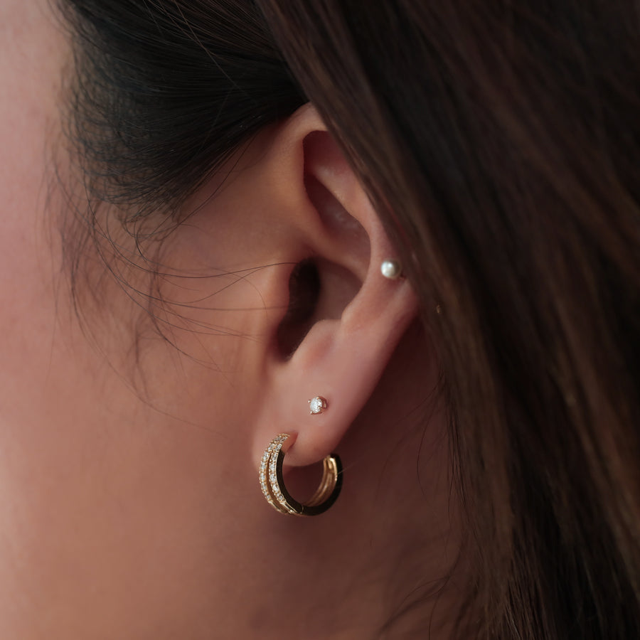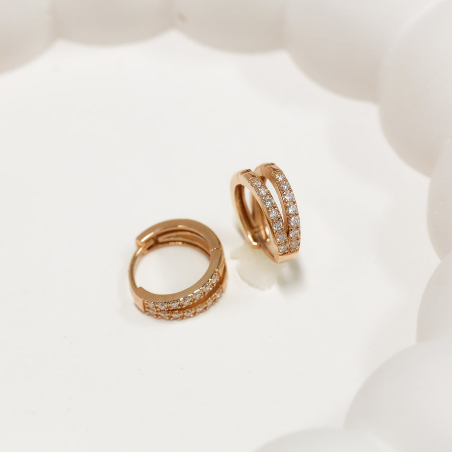 Double Arc with Double Lab Diamonds Accent Huggie Earrings – 14K Solid Gold Dual Hoop